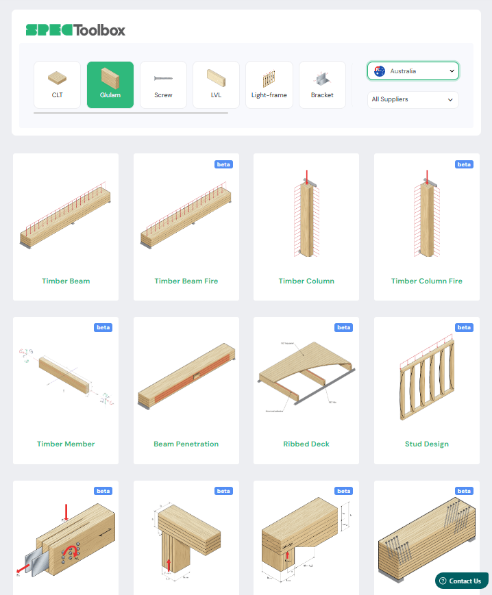 The SPEC Toolbox Glulam Calculator unifies the complex landscape of Australian & European supply. Whether you are specifying local ASH, or imported Binderholz product – the tool with Eurocode 5 & AS1720 included, has got you covered!