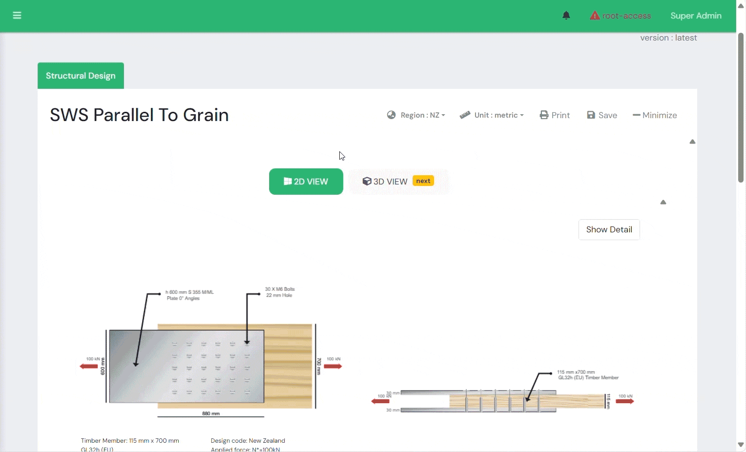 Designed for Plywood-Wood connections, these calculators cater to scenarios where engineers require plywood alongside timber. They support configurations of Plywood-Wood (PW) members with dowel or bolt connections. The plywood can be positioned parallel, perpendicular, or at an angle relative to the timber grain, accommodating tensile or compressive forces. The calculator includes different suppliers (Timber link, ASH, CUSP, and Hyne), with options for supplier grades and dimensions manually input by the user. The PW connection design focuses on single shear cases. These calculators offer choices of different timber materials such as GLT, LVL, and SG. Users input the angle between the plywood and wood for PW configurations. Dynamic 2D and 3D images enable visualization of various bolt configurations (uneven, even bolt distribution, and circular bolt distribution). The calculators use the European Yield Model for New Zealand and Eurocode standards for analysis.