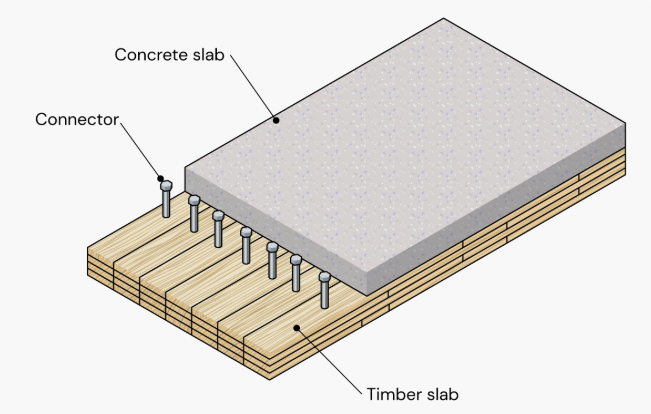 Timber–concrete composite floors combine the sustainability of timber with the stiffness and mass of concrete. This improves structural stiffness, vibration performance, and load capacity compared to timber-only floors.